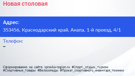 Новая, столовая по адресу 353456, Краснодарский край, Анапа, 1-й проезд, 4/1 в дальнейшем Организация, размещена в следующих категориях: