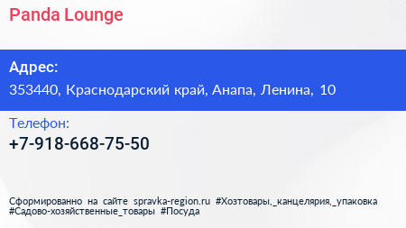 Panda Lounge по адресу 353440, Краснодарский край, Анапа, Ленина, 10 в дальнейшем Организация, размещена в следующих категориях: