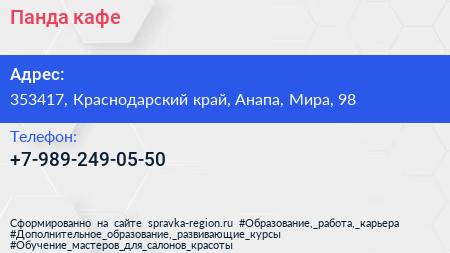 Панда, кафе по адресу 353417, Краснодарский край, Анапа, Мира, 98 в дальнейшем Организация, размещена в следующих категориях: