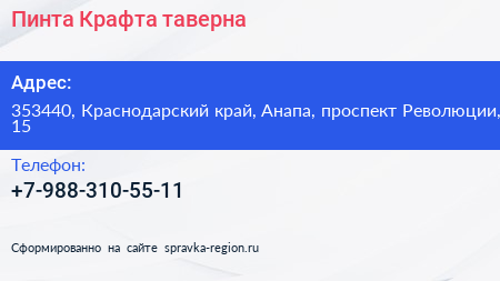 Пинта Крафта, таверна по адресу 353440, Краснодарский край, Анапа, проспект Революции, 15 в дальнейшем Организация, размещена в следующих категориях: