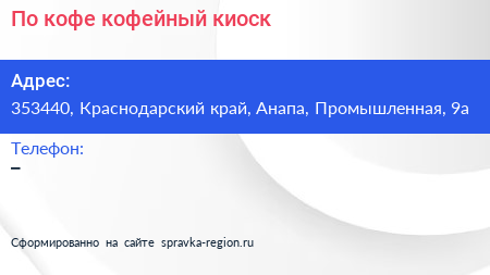По кофе, кофейный киоск по адресу 353440, Краснодарский край, Анапа, Промышленная, 9а в дальнейшем Организация, размещена в следующих категориях:
