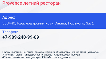 Provence, летний ресторан по адресу 353440, Краснодарский край, Анапа, Горького, 3а/1 в дальнейшем Организация, размещена в следующих категориях: