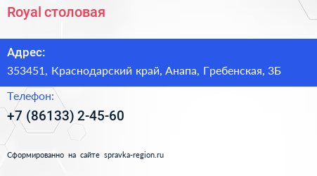 Royal, столовая по адресу 353451, Краснодарский край, Анапа, Гребенская, 3Б в дальнейшем Организация, размещена в следующих категориях: