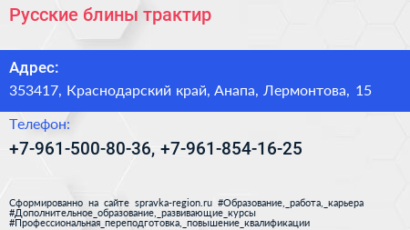 Русские блины, трактир по адресу 353417, Краснодарский край, Анапа, Лермонтова, 15 в дальнейшем Организация, размещена в следующих категориях: