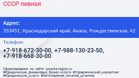 СССР, пивная по адресу 353451, Краснодарский край, Анапа, Рождественская, 42 в дальнейшем Организация, размещена в следующих категориях: