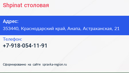 Shpinat, столовая по адресу 353440, Краснодарский край, Анапа, Астраханская, 21 в дальнейшем Организация, размещена в следующих категориях: