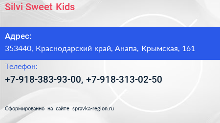 Silvi Sweet & Kids по адресу 353440, Краснодарский край, Анапа, Крымская, 161 в дальнейшем Организация, размещена в следующих категориях: