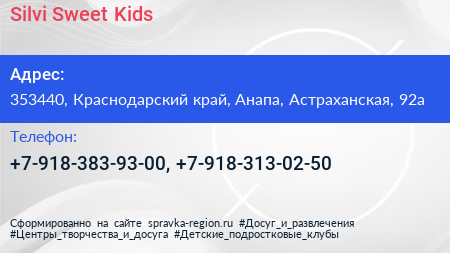 Silvi Sweet & Kids по адресу 353440, Краснодарский край, Анапа, Астраханская, 92а в дальнейшем Организация, размещена в следующих категориях: