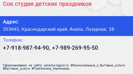 Сок, студия детских праздников по адресу 353445, Краснодарский край, Анапа, Лазурная, 18 в дальнейшем Организация, размещена в следующих категориях: