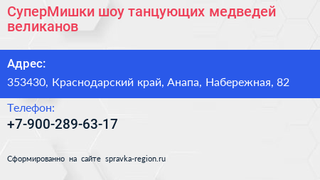 СуперМишки, шоу танцующих медведей великанов по адресу 353430, Краснодарский край, Анапа, Набережная, 82 в дальнейшем Организация, размещена в следующих категориях: