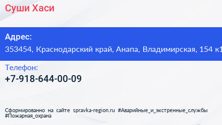 Суши Хаси по адресу 353454, Краснодарский край, Анапа, Владимирская, 154 к1 в дальнейшем Организация, размещена в следующих категориях: