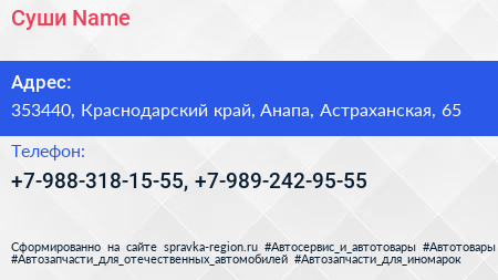 Суши Namе по адресу 353440, Краснодарский край, Анапа, Астраханская, 65 в дальнейшем Организация, размещена в следующих категориях: