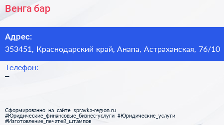 Венга, бар по адресу 353451, Краснодарский край, Анапа, Астраханская, 76/10 в дальнейшем Организация, размещена в следующих категориях: