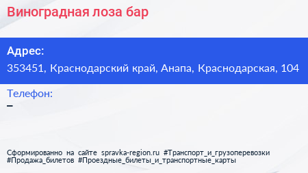 Виноградная лоза, бар по адресу 353451, Краснодарский край, Анапа, Краснодарская, 104 в дальнейшем Организация, размещена в следующих категориях: