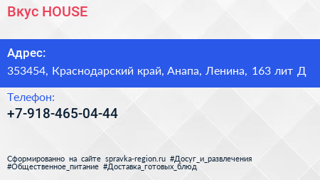 Вкус HOUSE по адресу 353454, Краснодарский край, Анапа, Ленина, 163 лит Д в дальнейшем Организация, размещена в следующих категориях: