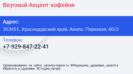 Вкусный Акцент, кофейня по адресу 353451, Краснодарский край, Анапа, Парковая, 60/2 в дальнейшем Организация, размещена в следующих категориях: