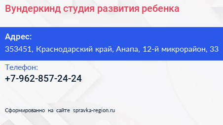 Вундеркинд, студия развития ребенка по адресу 353451, Краснодарский край, Анапа, 12-й микрорайон, 33 в дальнейшем Организация, размещена в следующих категориях: