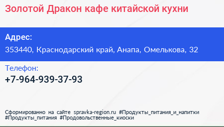 Золотой Дракон, кафе китайской кухни по адресу 353440, Краснодарский край, Анапа, Омелькова, 32 в дальнейшем Организация, размещена в следующих категориях: