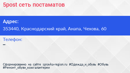 5post, сеть постаматов по адресу 353440, Краснодарский край, Анапа, Чехова, 60 в дальнейшем Организация, размещена в следующих категориях: