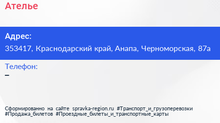 Ателье по адресу 353417, Краснодарский край, Анапа, Черноморская, 87а в дальнейшем Организация, размещена в следующих категориях: