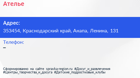 Ателье по адресу 353454, Краснодарский край, Анапа, Ленина, 131 в дальнейшем Организация, размещена в следующих категориях: