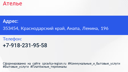 Ателье по адресу 353454, Краснодарский край, Анапа, Ленина, 196 в дальнейшем Организация, размещена в следующих категориях: