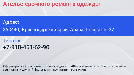 Ателье срочного ремонта одежды по адресу 353440, Краснодарский край, Анапа, Горького, 22 в дальнейшем Организация, размещена в следующих категориях: