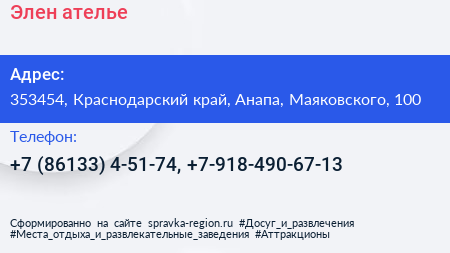 Элен, ателье по адресу 353454, Краснодарский край, Анапа, Маяковского, 100 в дальнейшем Организация, размещена в следующих категориях: