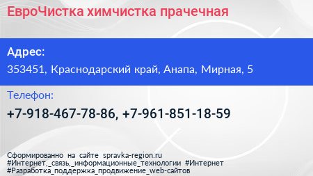 ЕвроЧистка, химчистка-прачечная по адресу 353451, Краснодарский край, Анапа, Мирная, 5 в дальнейшем Организация, размещена в следующих категориях: