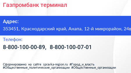 Газпромбанк, терминал по адресу 353451, Краснодарский край, Анапа, 12-й микрорайон, 24в в дальнейшем Организация, размещена в следующих категориях: