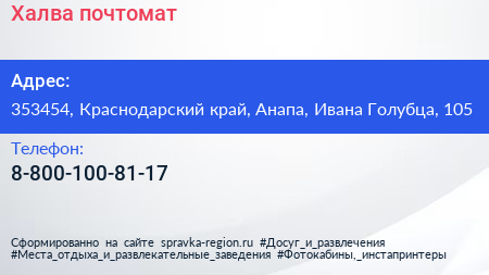 Халва, почтомат по адресу 353454, Краснодарский край, Анапа, Ивана Голубца, 105 в дальнейшем Организация, размещена в следующих категориях: