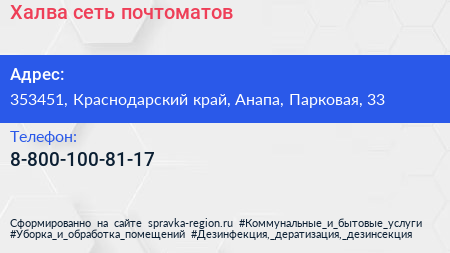 Халва, сеть почтоматов по адресу 353451, Краснодарский край, Анапа, Парковая, 33 в дальнейшем Организация, размещена в следующих категориях: