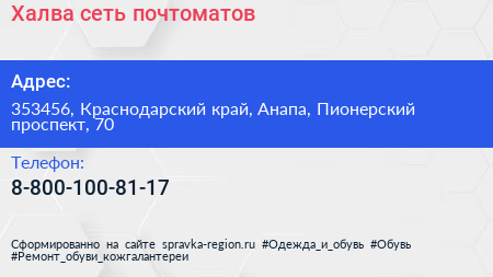 Халва, сеть почтоматов по адресу 353456, Краснодарский край, Анапа, Пионерский проспект, 70 в дальнейшем Организация, размещена в следующих категориях: