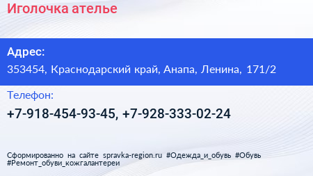 Иголочка, ателье по адресу 353454, Краснодарский край, Анапа, Ленина, 171/2 в дальнейшем Организация, размещена в следующих категориях: