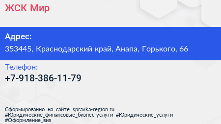 ЖСК Мир по адресу 353445, Краснодарский край, Анапа, Горького, 66 в дальнейшем Организация, размещена в следующих категориях: