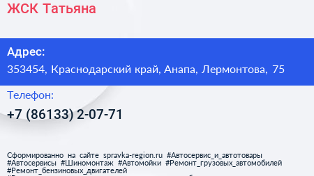 ЖСК Татьяна по адресу 353454, Краснодарский край, Анапа, Лермонтова, 75 в дальнейшем Организация, размещена в следующих категориях:
