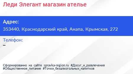 Леди Элегант, магазин-ателье по адресу 353440, Краснодарский край, Анапа, Крымская, 272 в дальнейшем Организация, размещена в следующих категориях: