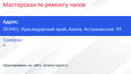 Мастерская по ремонту часов по адресу 353451, Краснодарский край, Анапа, Астраханская, 99 в дальнейшем Организация, размещена в следующих категориях: