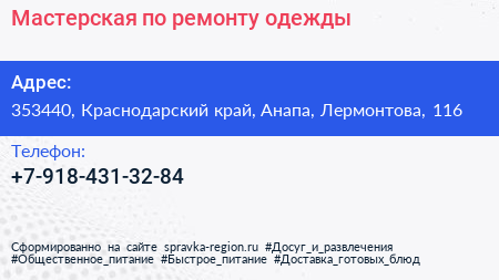 Мастерская по ремонту одежды по адресу 353440, Краснодарский край, Анапа, Лермонтова, 116 в дальнейшем Организация, размещена в следующих категориях: