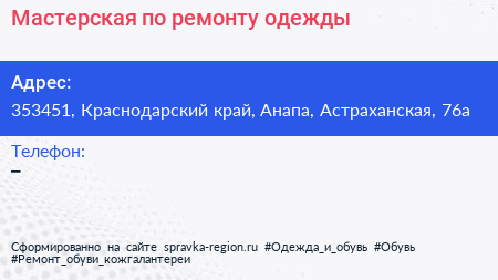 Мастерская по ремонту одежды по адресу 353451, Краснодарский край, Анапа, Астраханская, 76а в дальнейшем Организация, размещена в следующих категориях: