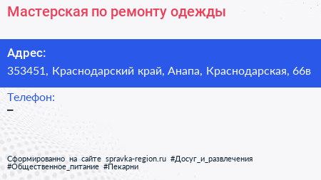 Мастерская по ремонту одежды по адресу 353451, Краснодарский край, Анапа, Краснодарская, 66в в дальнейшем Организация, размещена в следующих категориях: