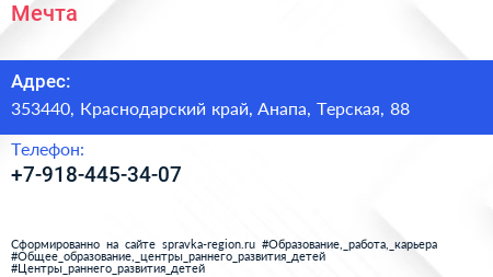 Мечта по адресу 353440, Краснодарский край, Анапа, Терская, 88 в дальнейшем Организация, размещена в следующих категориях: