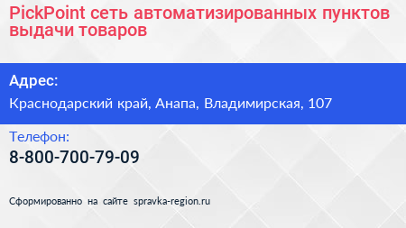 PickPoint, сеть автоматизированных пунктов выдачи товаров по адресу Краснодарский край, Анапа, Владимирская, 107 в дальнейшем Организация, размещена в следующих категориях: