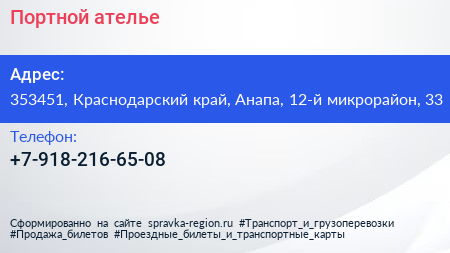 Портной, ателье по адресу 353451, Краснодарский край, Анапа, 12-й микрорайон, 33 в дальнейшем Организация, размещена в следующих категориях: