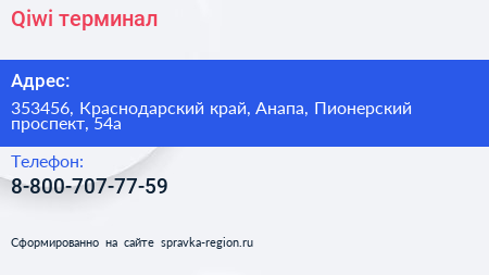 Qiwi, терминал по адресу 353456, Краснодарский край, Анапа, Пионерский проспект, 54а в дальнейшем Организация, размещена в следующих категориях: