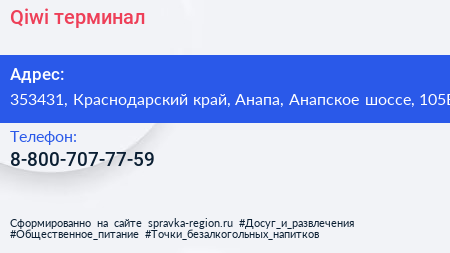Qiwi, терминал по адресу 353431, Краснодарский край, Анапа, Анапское шоссе, 105Б в дальнейшем Организация, размещена в следующих категориях: