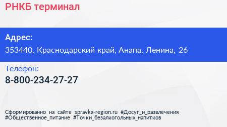РНКБ, терминал по адресу 353440, Краснодарский край, Анапа, Ленина, 26 в дальнейшем Организация, размещена в следующих категориях: