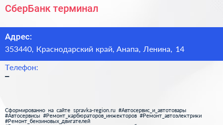 СберБанк, терминал по адресу 353440, Краснодарский край, Анапа, Ленина, 14 в дальнейшем Организация, размещена в следующих категориях:
