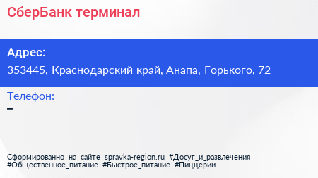 СберБанк, терминал по адресу 353445, Краснодарский край, Анапа, Горького, 72 в дальнейшем Организация, размещена в следующих категориях: