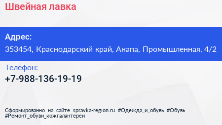 Швейная лавка по адресу 353454, Краснодарский край, Анапа, Промышленная, 4/2 в дальнейшем Организация, размещена в следующих категориях: